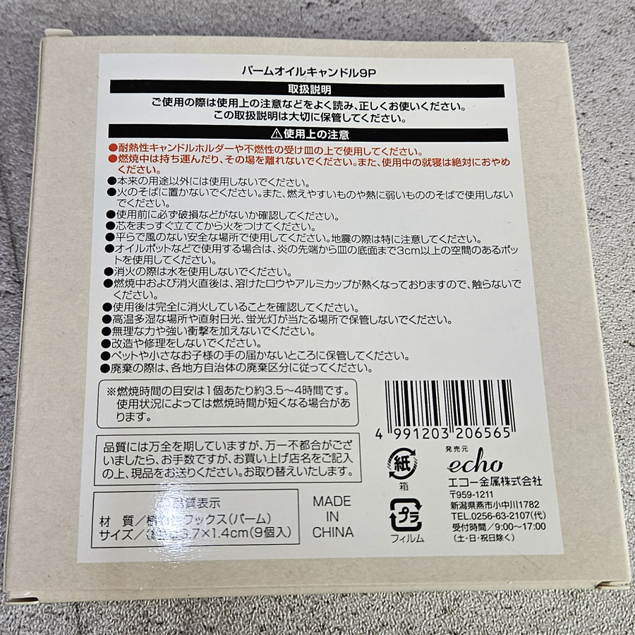 天然パームオイル使用 燃焼中のすすなどが少ない 燃焼時間:約4時間 無香料タイプ9個入 φ37X140mm/個 ■生産地:中国 ■素材・成分:食物性ワックス(パーム)